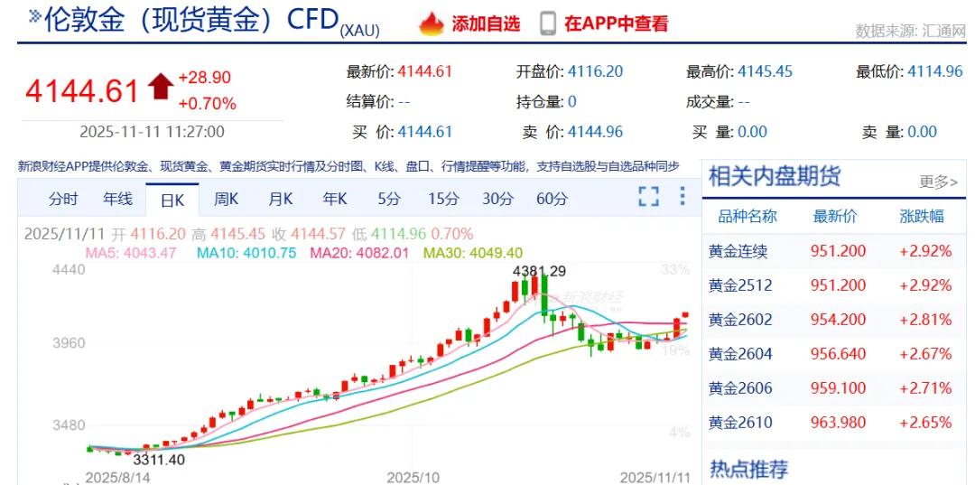 11月11日,国际金价继续走高,现货黄金突破4140美元,截至发稿报4144.61美元,本周已涨超3%。